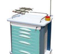 ABS body, metal ball bearing rail, A-aluminum columns, B-plastic-steel, columns, needle disposal holder (optional), dust basket, IV pole, concave top covered with transparent soft plastic glass, centralized lock, 2 small and 3 big drawer, inner with partitions can be well organized, drawer repositioned easily, luxurious noiseless casters.