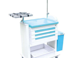 ABS body, metal ball-bearing rail. Aluminum columns B-plastic-steel columns. IV pole. Dust basket, utility container, file bag, multi bin container, sliding side shelf, concave top covered with transparent soft plastic glass, centralized lock, 2 small and 3 big drawer, inner with partitions can be well organized. Drawers repositioned easily. Luxurious noiseless casters.