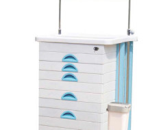 ABS body, metal ball bearing rail, plastic steel columns, IV pole, needle disposal holder(optinal), dust basket, utility container, multi bin container, sliding side shelf and drawer, stainless steel guard rail, concave top covered with transparent soft plastic plastic glass, centralized lock, 2 small and 3 big drawer with label card, inner with partitions can be well organized, drawers repositioned easily, luxurious noiseless casters.