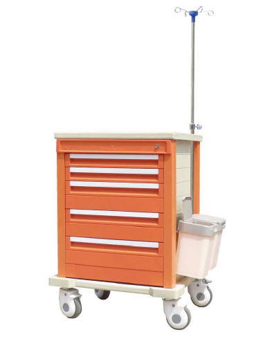 ABS body, metal ball bearing rail, A-aluminum columns, B-plastic-steel columns, dust basket, utility container, file bag, IV pole, sliding side shelf, concave top covered with transparent soft plastic glass, centralized lock, 2 small and 3 big drawer, inner with partitions can be well organized, drawer repositioned easily, luxurious noiseless casters.