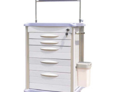 ABS body, metal ball bearing rail, plastic-steel columns, needle disposal holder (optional), dust basket, utility container, IV pole, sliding side shelf and drawer, stainless steel guard rail, concave top covered with transparent soft plastic glass, centralized lock, 2 small and 3 big drawer , inner with partitions can be well organized, drawer repositioned easily, luxurious noiseless casters.