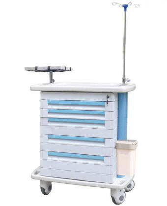 Product Code: E102 850 x 520 x 950mm Emergency Trolley ABS body, metal ball bearing rail, A-aluminum columns B-plastic-steel columns, IV pole, dust basket, defibrillator shelf, power outlet and hooks, oxygen tank holder (optional), CPR board(optional0, concave top covered with transparent soft plastic glass, centralized lock, 2 small and 3 big drawer, inner with partitions can be organized, drawers repositioned easily, luxurious noiseless casters.