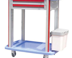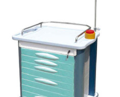 ABS body, metal ball bearing, A-aluminum columns, B-plastic-steel columns, IV pole, dust basket, defibrillator shelf, CPR board, (optional), concave top covered with transparent plastic galss, centralized lock, 2 small and 3 big drawer, inner with partitions can be well organized, luxurious noiseless casters.