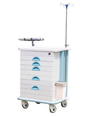 ABS body, metal ball bearing, A-aluminum columns, B-plastic-steel columns, IV pole, dust basket, defibrillator shelf, CPR board, (optional), concave top covered with transparent plastic galss, centralized lock, 2 small and 3 big drawer, inner with partitions can be well organized, luxurious noiseless casters.
