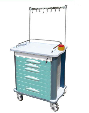 ABS body, metal ball bearing rail, aluminum columns, needle disposal holder (optional), dust basket, utility container, IV pole, sliding side shelf and drawer, stainless steel guard rail, concave top covered with transparent soft plastic glass, centralized lock, 2 small and 3 big drawer, inner with partitions can be well organized, drawer repositioned easily, luxurious noiseless casters.