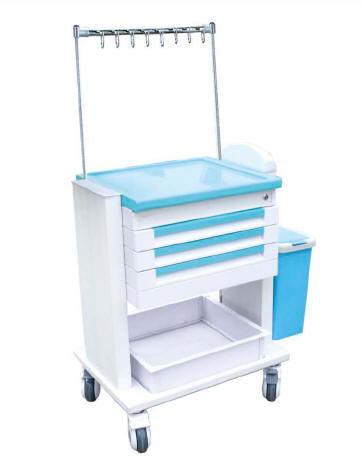 ABS body, metal ball bearing rail, A-aluminum columns, B-plastic-steel columns, needle disposal )optional), dust basket, IV pole, concave top covered with transparent soft plastic glass, centralized lock, 2 small and 3 big drawer, inner with partitions can be well organized, drawer repositioned easily, with a spare container bottom, luxurious noiseless casters.
