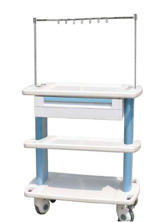 ABS body, metal ball bearing rail, C-aluminum columns, plastic-steel columns, dust basket, IV pole, three layers, concave top covered with transparent soft plastic glass, 1 big drawer, inner with partitions can be well organized, drawer repositioned easily, luxurious noiseless casters.